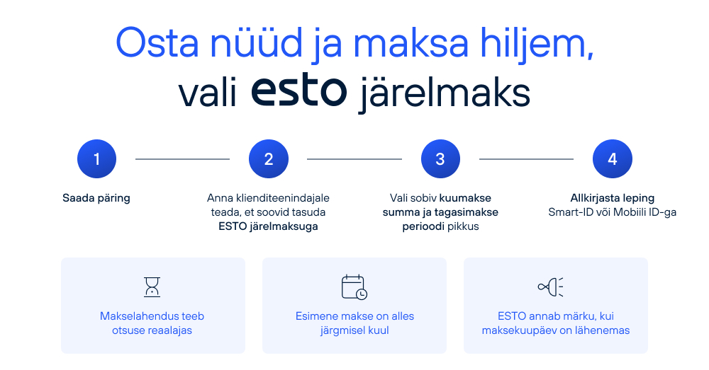 ESTO järelmaksu puhul on tegemist innovatiivse makselahendusega, mis aitab koostada sulle sinu poolt valitud perioodi alusel maksegraafiku. Makselahendus teeb otsuse reaalajas ning aitab ostu sooritada vähem kui 60 sekundiga.